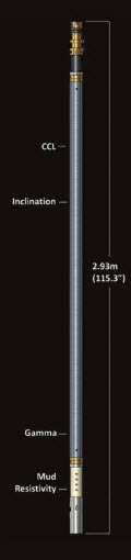The telemetry module is the uppermost tool in the stack. Its main function is to collect and combine digital data from all the other tools and to transmit this in a digital form via the logging wireline to the surface acquisition system. It also provides control functions and tool power to the other logging tools. The tool includes natural-gamma, CCL,mud-resistivity and borehole-tilt measurements.